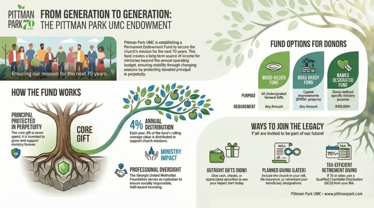 On March 23, 2026, in their 70th year, Pittman Park UMC established an endowment fund to secure the church’s mission “for the next 70 years.” This fund creates a long-term source of income for ministries beyond the annual operating budget, ensuring stability through changing seasons by protecting donated principal in perpetuity. The fund was seeded with $250,000 from the Wood-Dozier fund.